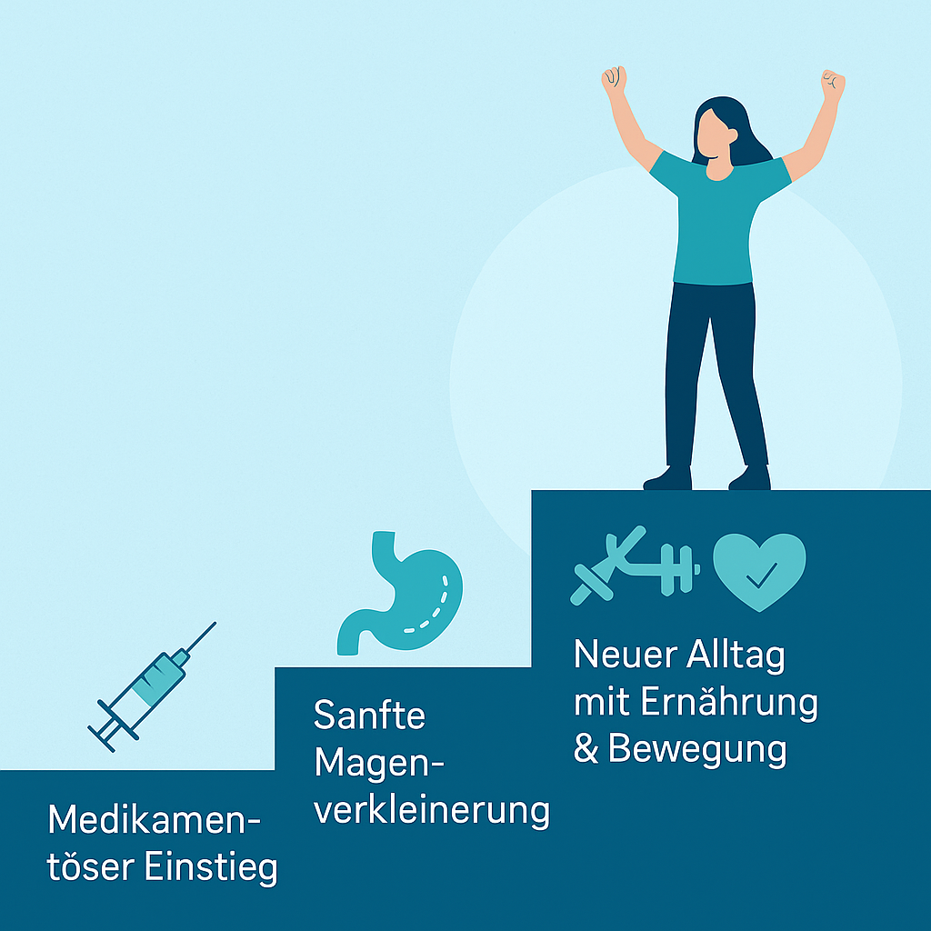 Unser dreistufiges Konzept hat ein klares Ziel: nachhaltigen Gewichtsverlust von bis zu 50 % – wissenschaftlich fundiert, medizinisch begleitet und realistisch umsetzbar.
